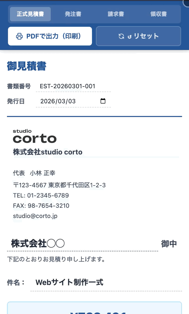 シミュレーションで算出した結果をそのまま引き継ぎ、ワンクリックでフォーマルな「正式書類(PDF)」を即座に発行。 そのまま請求書や領収書にもワンタッチで変換できるため、月末の面倒な経理作業もすぐ終わります。