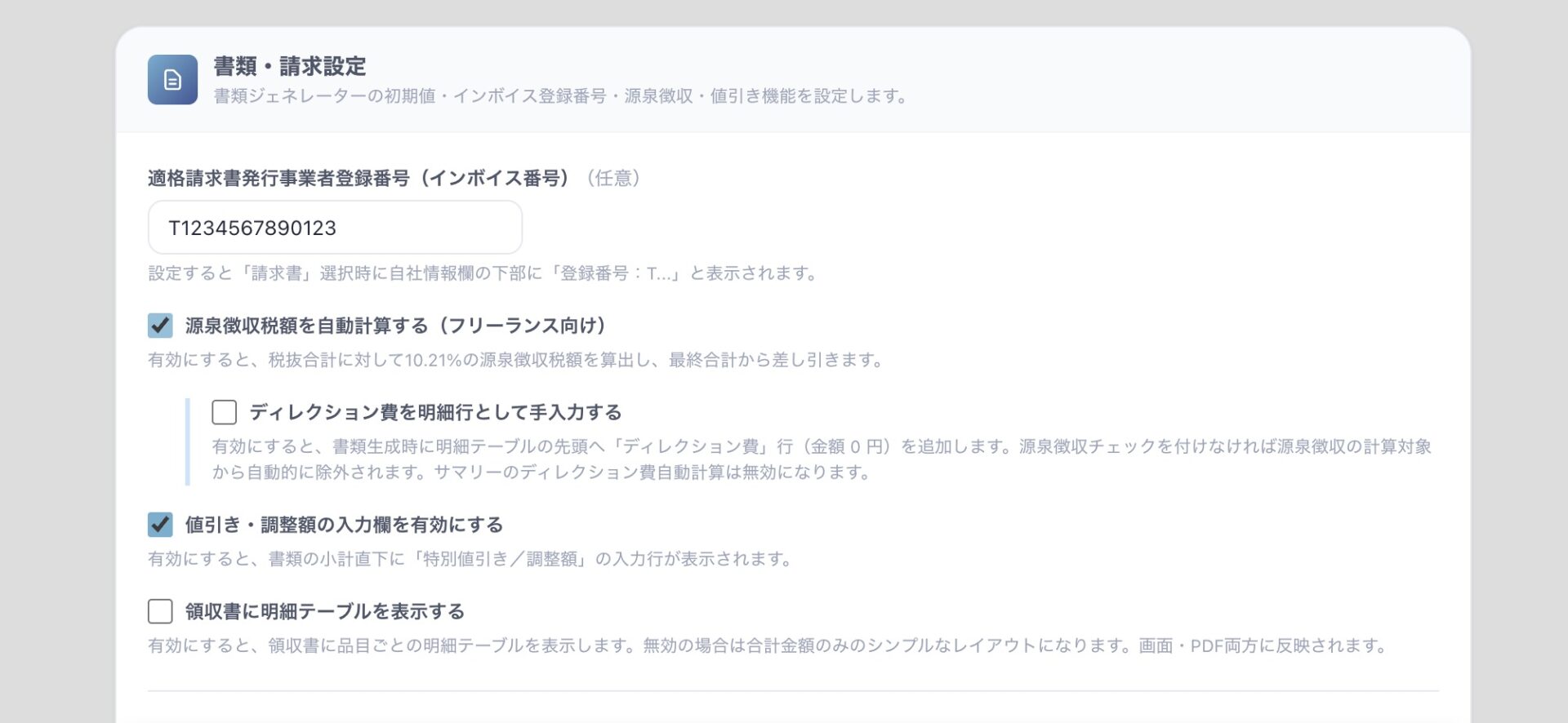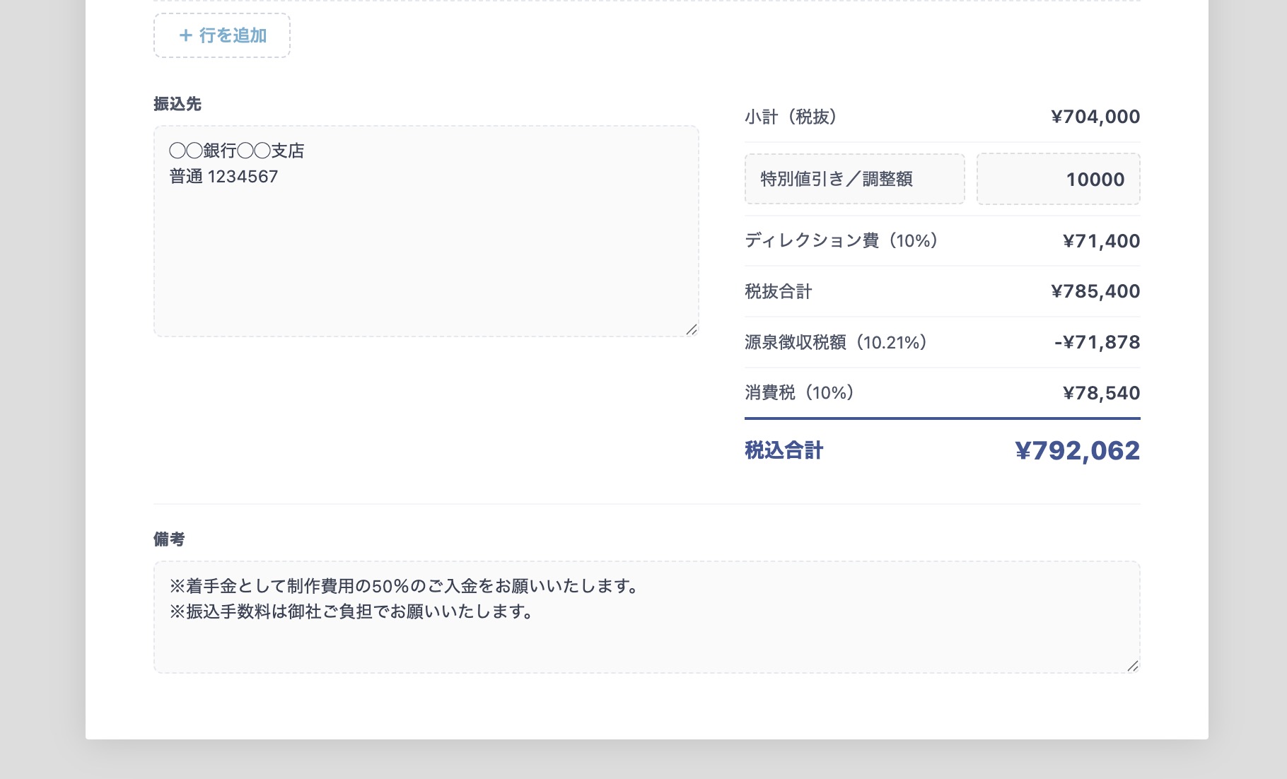 - 値引き・調整額の入力:端数調整や特別割引を記載できる専用行をオン・オフできます。