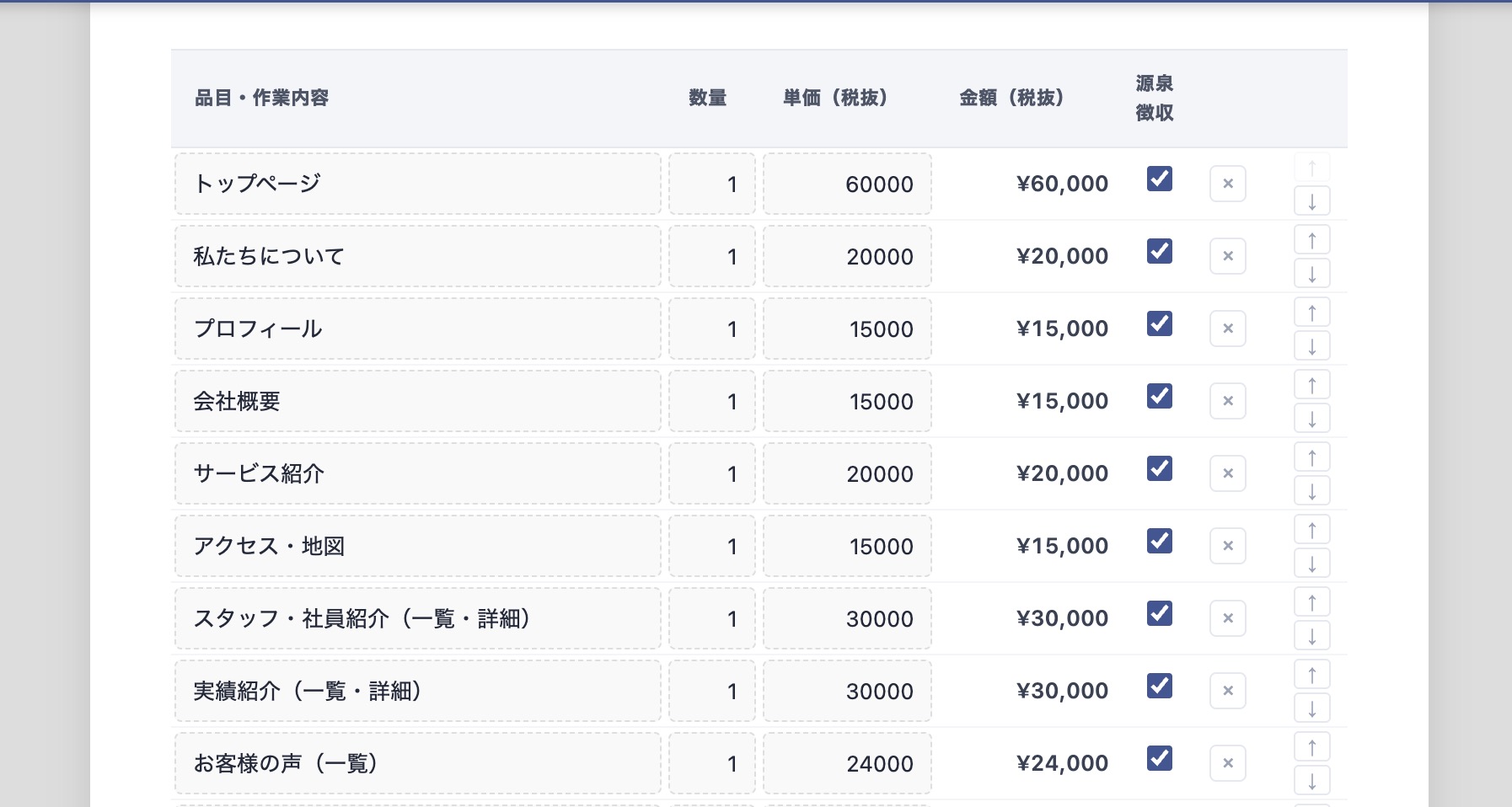 - 行ごとの源泉徴収計算:フリーランスに必須の源泉徴収。「この品目だけ源泉の対象にしたい」という場合も、行のチェックボックスをONにするだけで自動計算して最終合計から差し引きます(管理画面で選択しなければ非表示になります)。