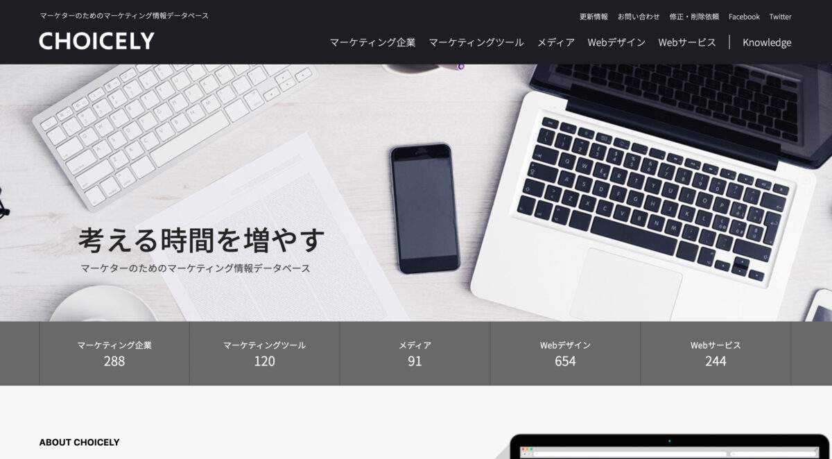 マーケターのためのマーケティング情報データベース『Choicely』。こちらはWebサイトギャラリーだけではなく、マーケティング企業の紹介や、マーケティングツールの紹介、メディア紹介、Webサービスの紹介など、マーケター目線で役立つ情報を集められています。