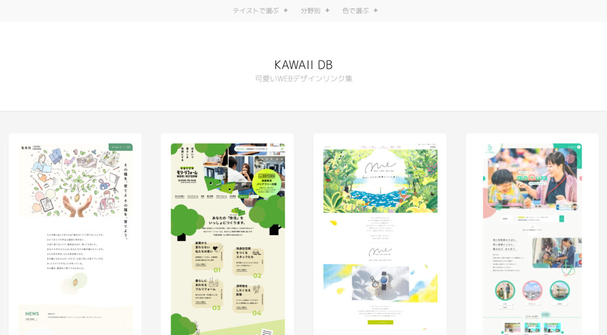 可愛いWEBデザインリンク集『Kawaii DB』。かわいいに特化したWebデザインギャラリーサイトは見かけないので便利ですね。トップページ全体のデザインを見れるのもうれしい。