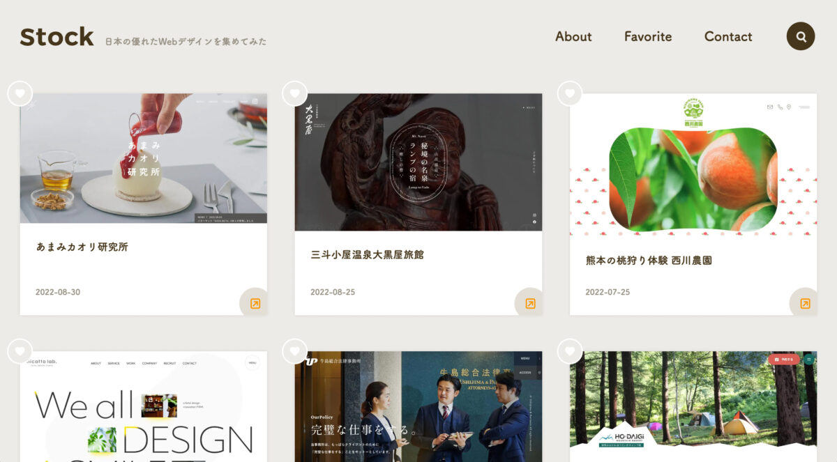 日本のWebデザインギャラリー『Stock』。国内の素晴らしいWebデザインを対象にキュレーション。Webデザインギャラリーの存在意義は多様ですが、制作現場で参考にしたい、クライアントが制作を依頼する前に参考にしやすいWebデザインギャラリーが欲しい人のためのWebデザインギャラリーサイト。インスピレーションを刺激したい方はぜひご覧ください。