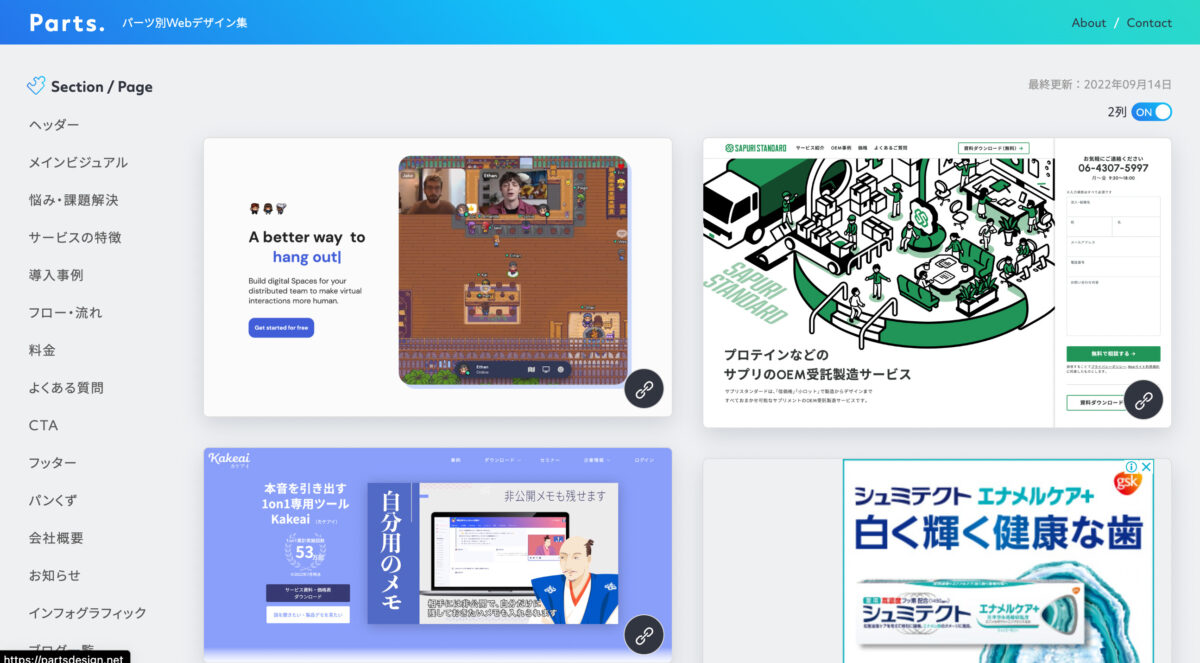 Webサイトの部分的なデザインを紹介している『Parts.』。ヘッダー、メインビジュアル、フロー、料金、よくある質問、CTA、フッターなど22カテゴリー分けされているので目的のデザインが探しやすい。この手のWebデザインギャラリーは少ないのでありがたいですね。