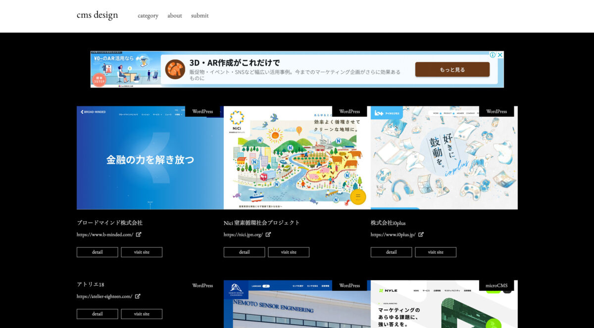 CMSで構築されたWebサイトを紹介している『cms design』。日本語サイトに特化したキュレーターの趣向を反映されているとのことで、クライアントに紹介しやすいサイトが集まっています。