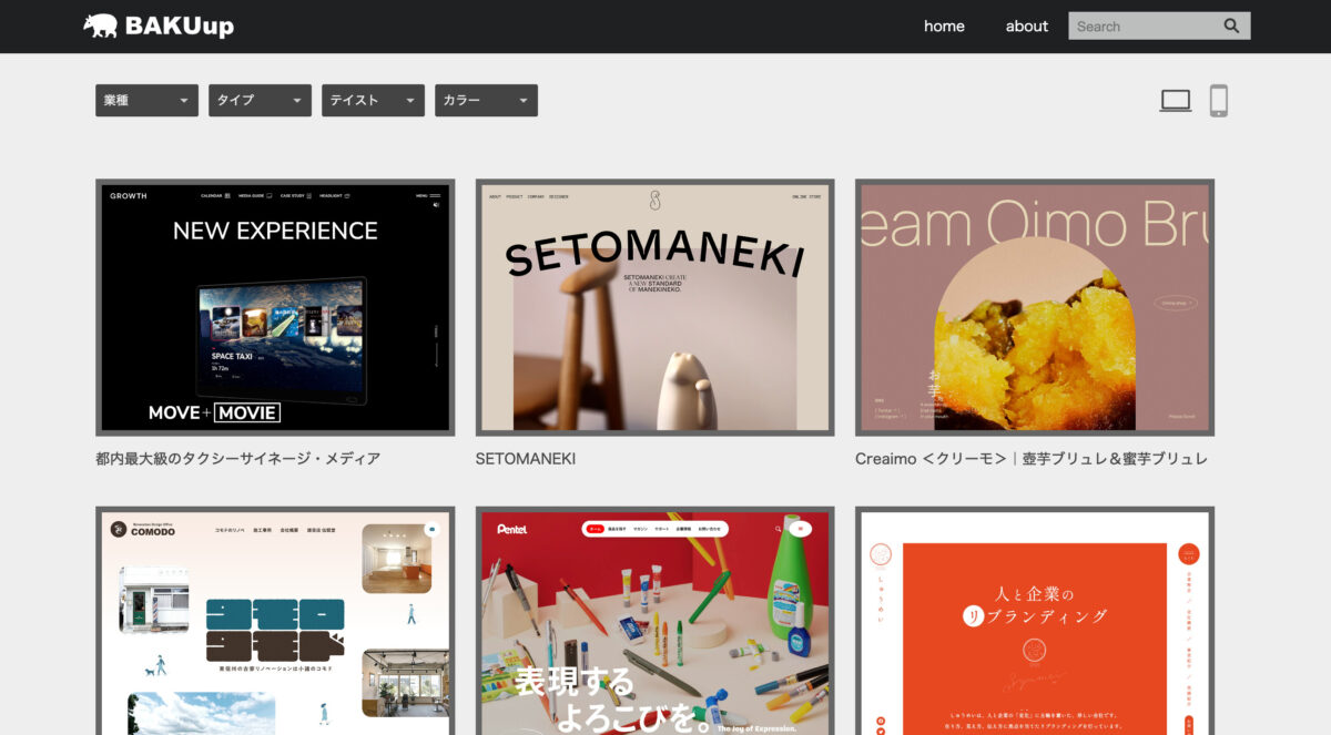 優れたWebサイトデザインを集めた『BAKUup』。一覧のサムネイルをPCデザイン、スマホデザインで切り替えられるのはうれしい機能。主旨とは関係ないけどロゴとページトップボタンが