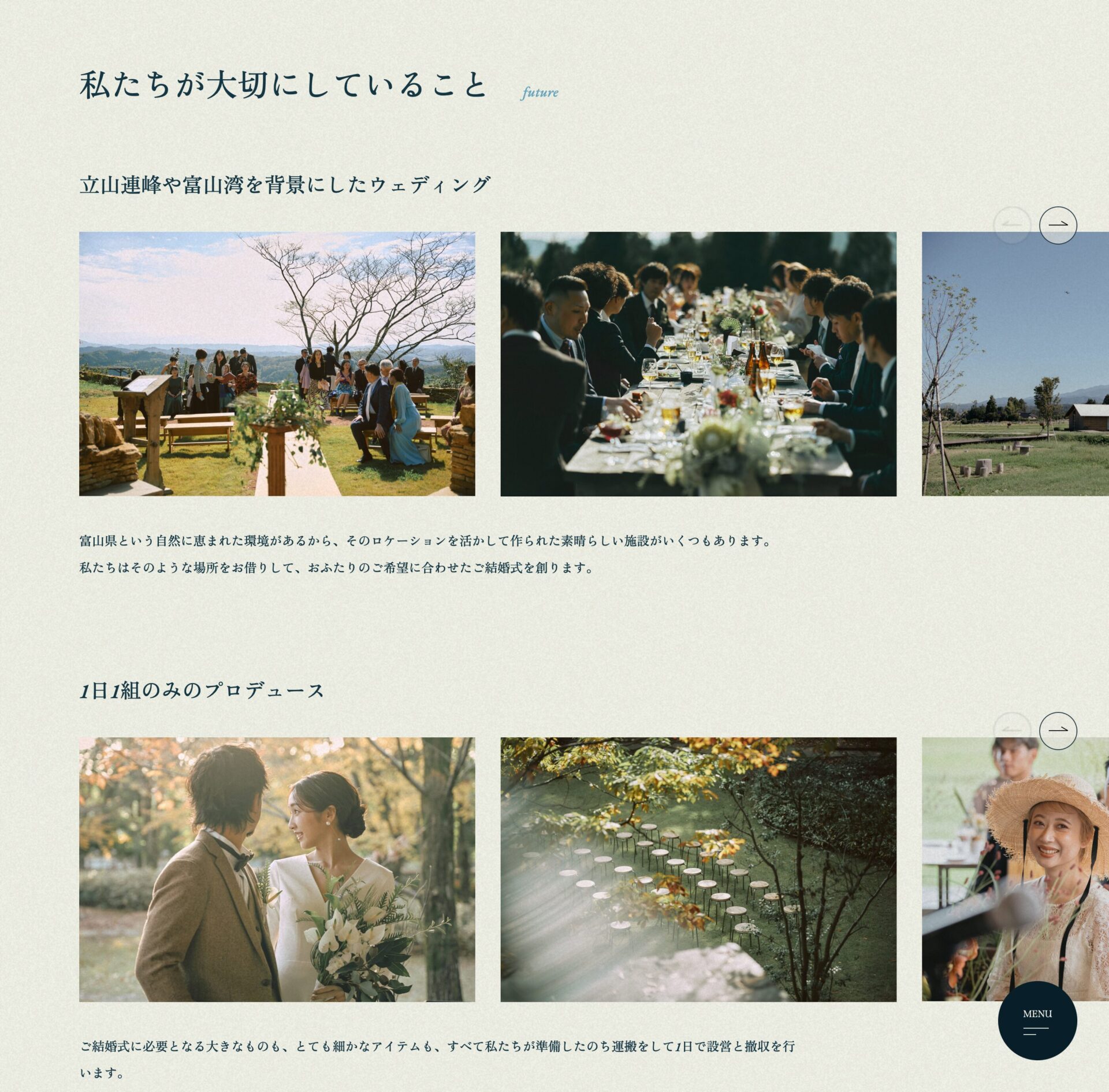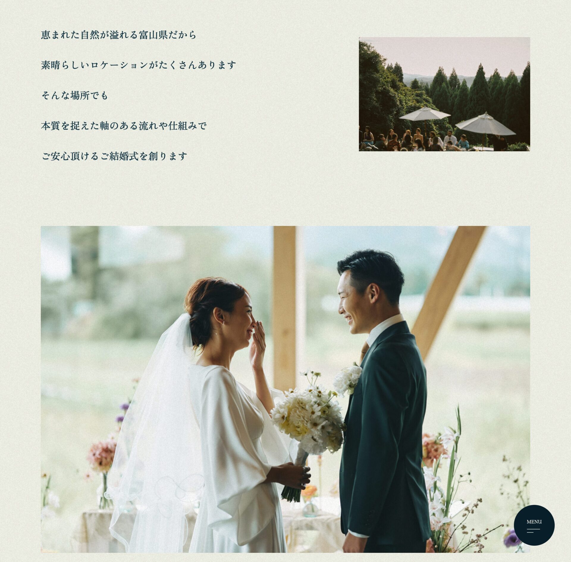また、富山の自然を活かした結婚式を提供していることを明確に提示するのと、印象的な写真をスライド表示させることで、個性的なウェディングができることも明示しました。